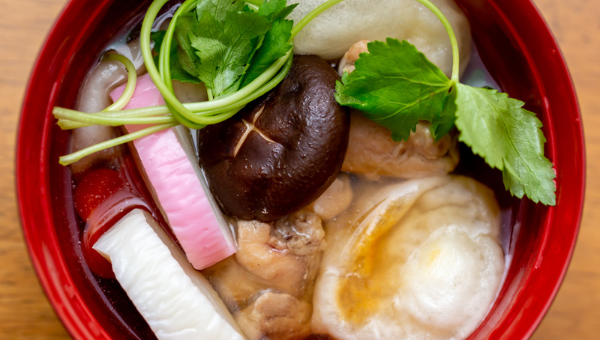 お雑煮は本来、年神様にお供えした鏡もちをいただくための料理です。お雑煮は本膳料理の前菜である「保臓(ほうぞう)」に由来し、「お餅などを入れて雑多に煮込む」ことから「雑煮」になりました。お餅の形、味噌の種類、具材などは地域によって多種多様で、郷土色豊かな料理です。
